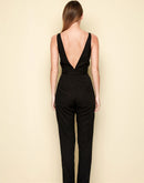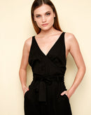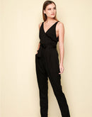 Being glamorous in black colors wearing Calipso jumpsuit . A Stylish long V-neckline and flattering wrap fit . high waist with wrap around belt. Side pockets. V-backline with zipper