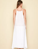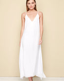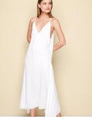 An effortless flowing dress with A-line silhouette. Can be an easy casual look with slides or evening look with heeled. V-neck, adjustable straps. Inverted V details on waist . Ending at ankle.Partially lined.