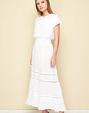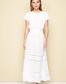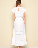 Our sweet Milk & Roses signature dress for a daily escape or an event if heeled. Featuring a high rounded neckline and delicate pleats details below.Short sleeves with pleated details.Center back button with keyhole at back and high smoke fitted elastic at waist.
