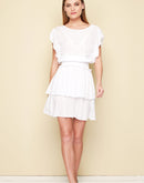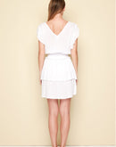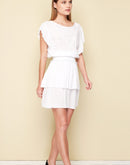 Being glamorous in vintage color for a romantic date. Mini dress with boat shape neckline and V pleated top details on front. Two delicate flared sleeves. High waist smoke part with lugh ruffle for a stylish look. A two layer skirt avoids transparency. V backline. To combine with slides or heels. V backline